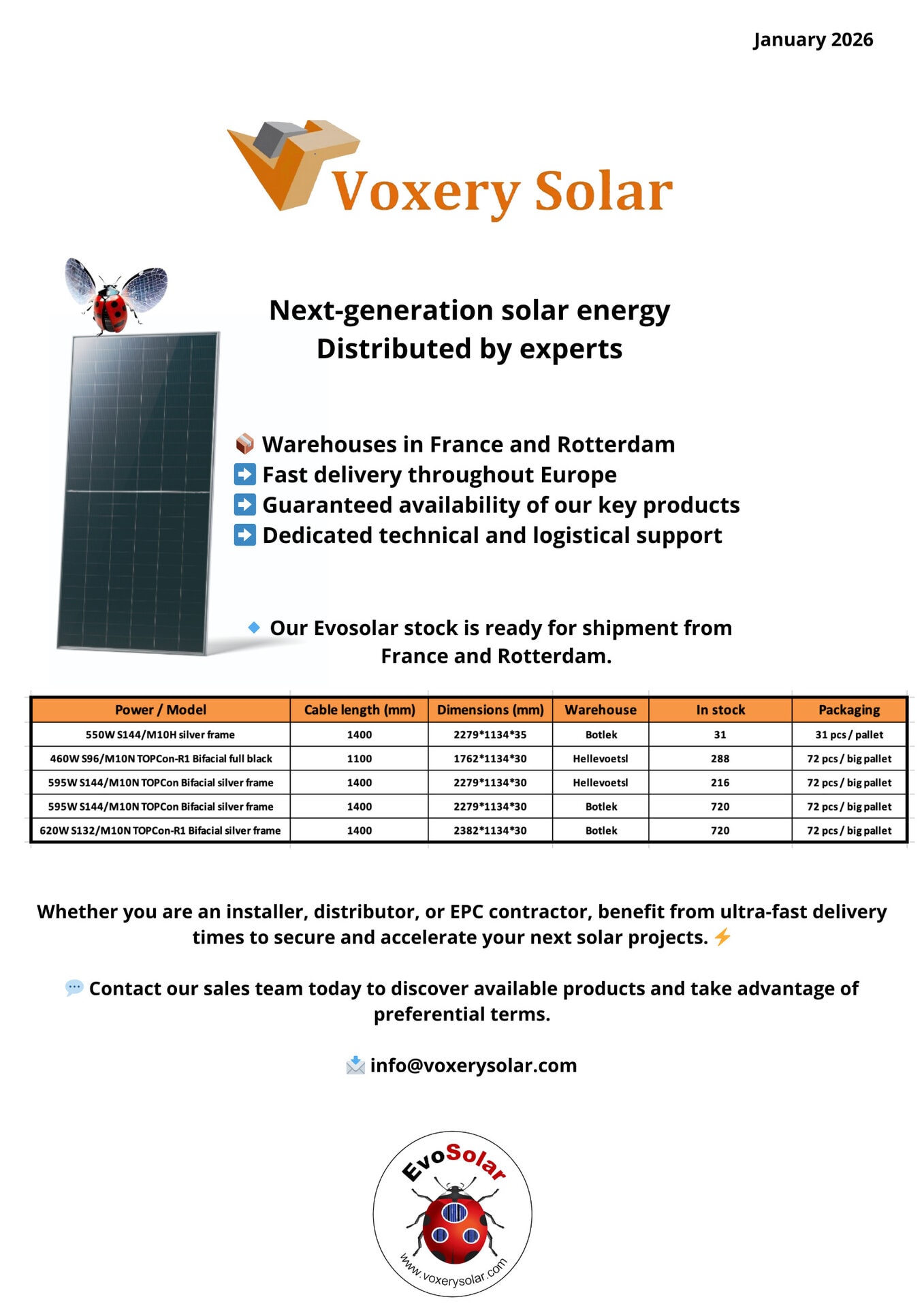 Stock Evosolar Voxery Solar > Stock Evosolar At Voxery Solar, we currently have a stock of solar panels available. You can check availability directly on this page. View available stock