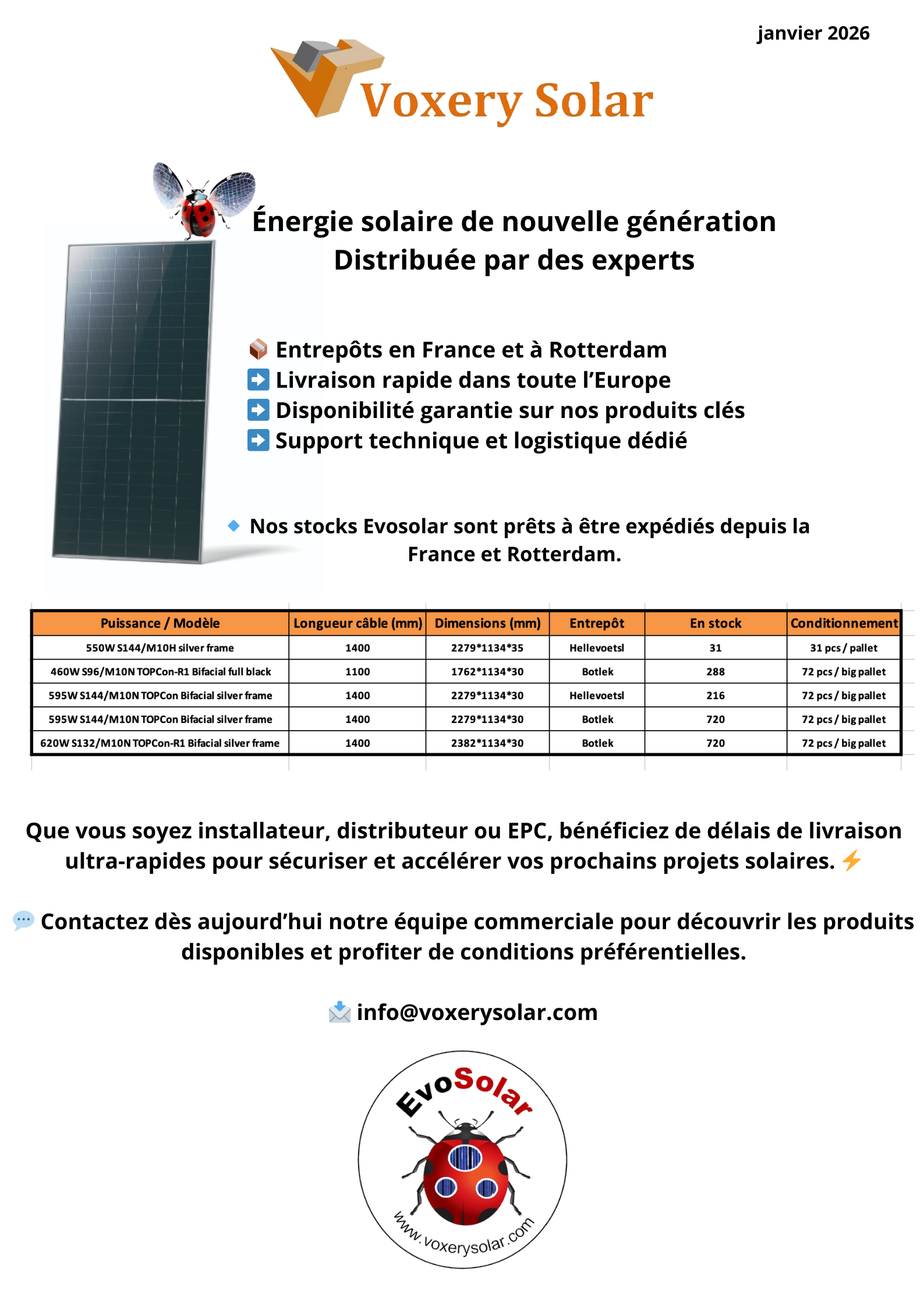 Chez Voxery Solar, nous disposons actuellement d’un stock de panneaux solaires disponibles. Vous pouvez consulter la disponibilité des produits directement sur cette page.